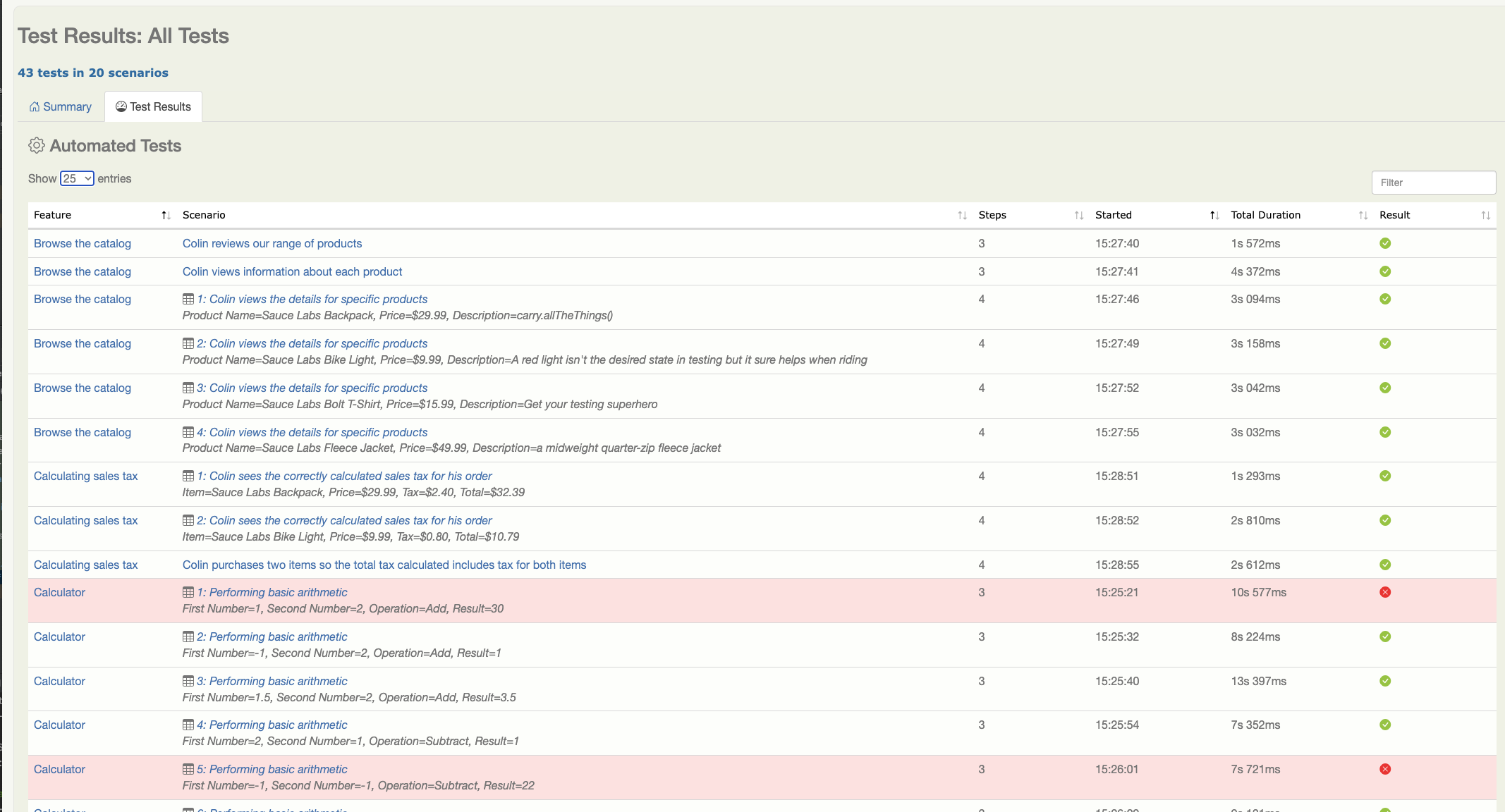 To avoid confusion in the summary views, the reports now adopt a more conventional definition of scenarios and test cases for data-driven tests. Scenario refers to the scenario outline or overall test, whereas Test Case refers to a specific execution of a scenario with a specific set of test data.