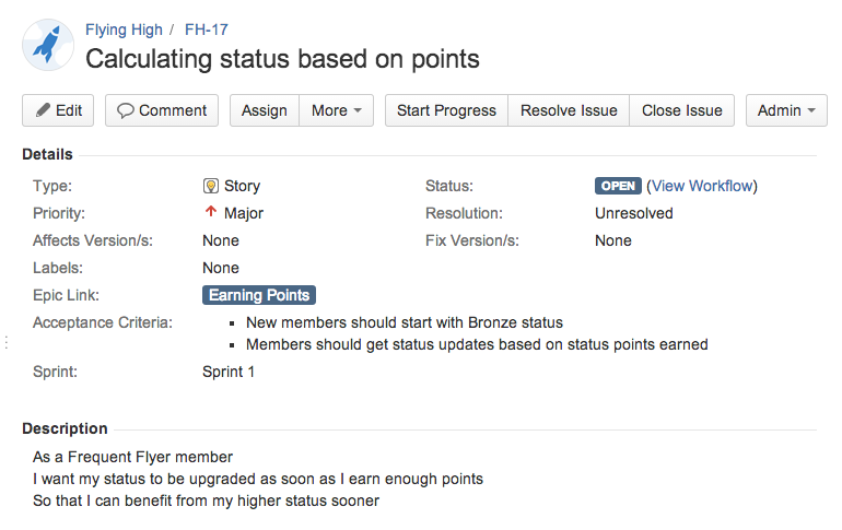 Suppose we are implementing a Frequent Flyer application for an airline. The idea is that travelers will earn points when they fly with our airline, based on the distance they fly. Travelers start out with a “Bronze” status, and can earn a better status by flying more frequently. Travelers with a higher frequent flyer status benefit from advantages such as lounge access, prioritized boarding, and so on. One of the story cards for this feature might look like the following: