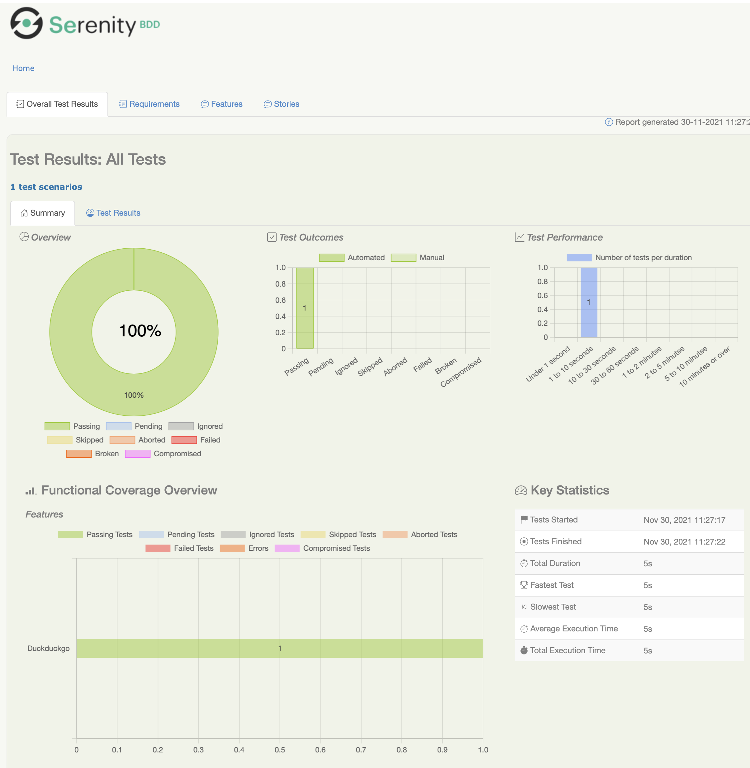 Ahora abre el archivo index.html en el directorio target/site/serenity. Deberías ver algo como esto: