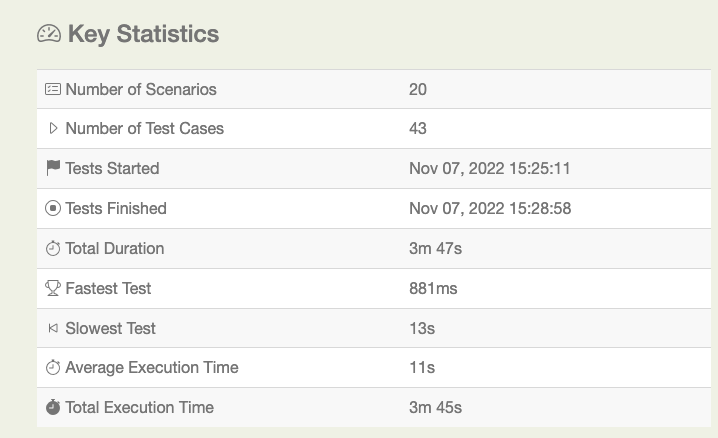 To avoid confusion in the summary views, the reports now adopt a more conventional definition of scenarios and test cases for data-driven tests. Scenario refers to the scenario outline or overall test, whereas Test Case refers to a specific execution of a scenario with a specific set of test data.