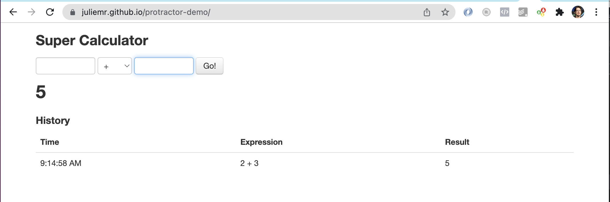 Suponha que nosso teste de calculadora precise interagir com uma UI web, como a em https://juliemr.github.io/protractor-demo/ mostrada aqui: