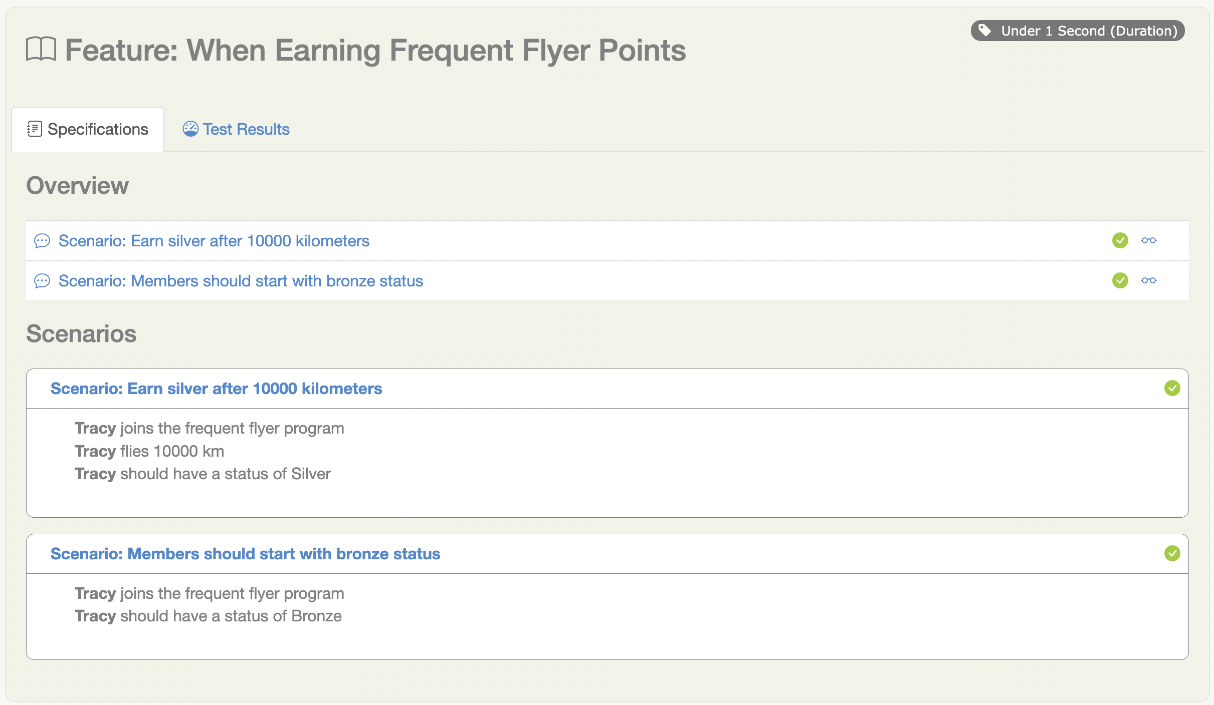 Esta abordagem usa o conceito de bibliotecas de passos de persona, onde uma biblioteca de passos representa as ações de um usuário específico realizando uma tarefa específica (Tracy a viajante que está ganhando pontos). Neste caso, o Serenity automaticamente instanciará o campo actor com o nome da variável da biblioteca de passos (tracy), permitindo que apareça nos relatórios de teste para torná-los mais legíveis: