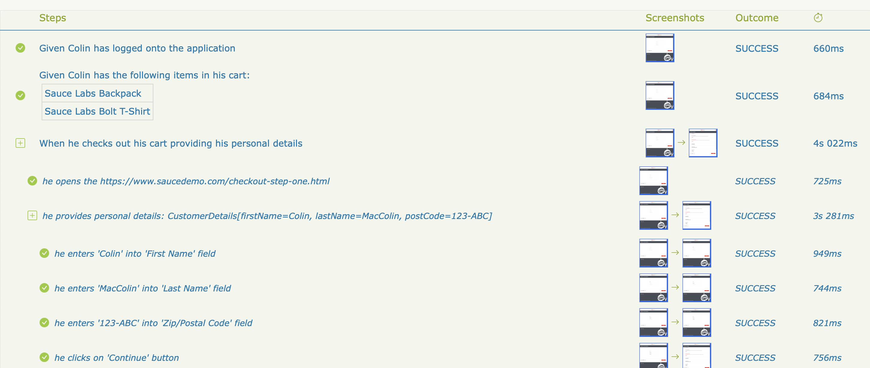 O Serenity não apenas relata quais requisitos foram testados, mas também relata como eles foram testados. Ele inclui detalhes passo a passo de como um teste foi executado, incluindo capturas de tela opcionais, para que seus testes realmente documentem o que sua aplicação faz.